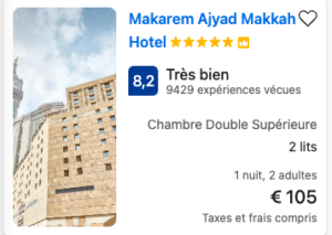 À La Mecque, c’est souvent un peu plus cher, surtout près de la Masjid Al-Haram. Mais avec un peu de recherche, tu peux trouver des options pour tous les budgets :